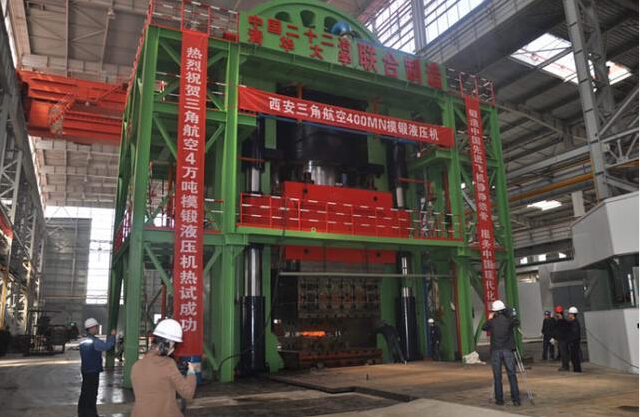 2012年3月3日,中國(guó)首臺(tái)40000噸級(jí)模鍛液壓機(jī),在西安閻良三角航空科技有限責(zé)任公司進(jìn)行熱試車,并順利鍛造出了大型盤類件產(chǎn)品。該機(jī)采用鋼絲纏繞預(yù)應(yīng)力結(jié)構(gòu)。